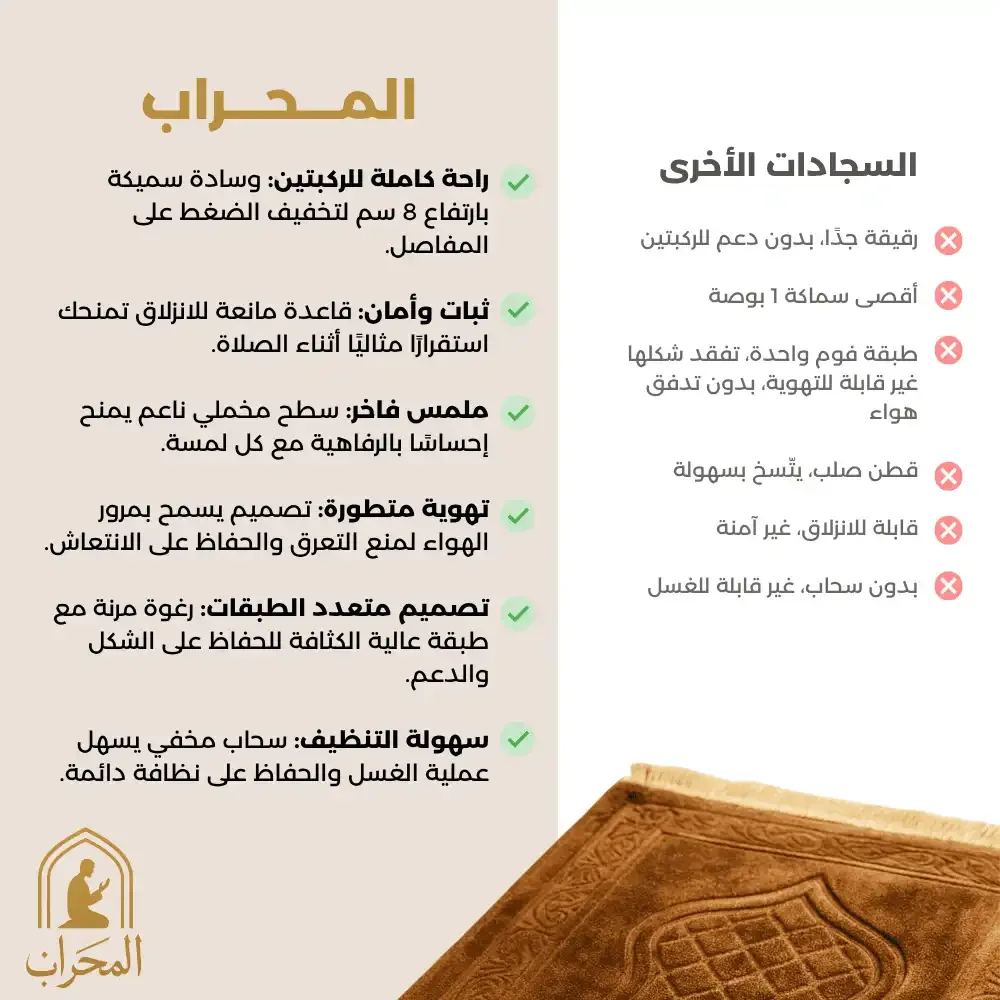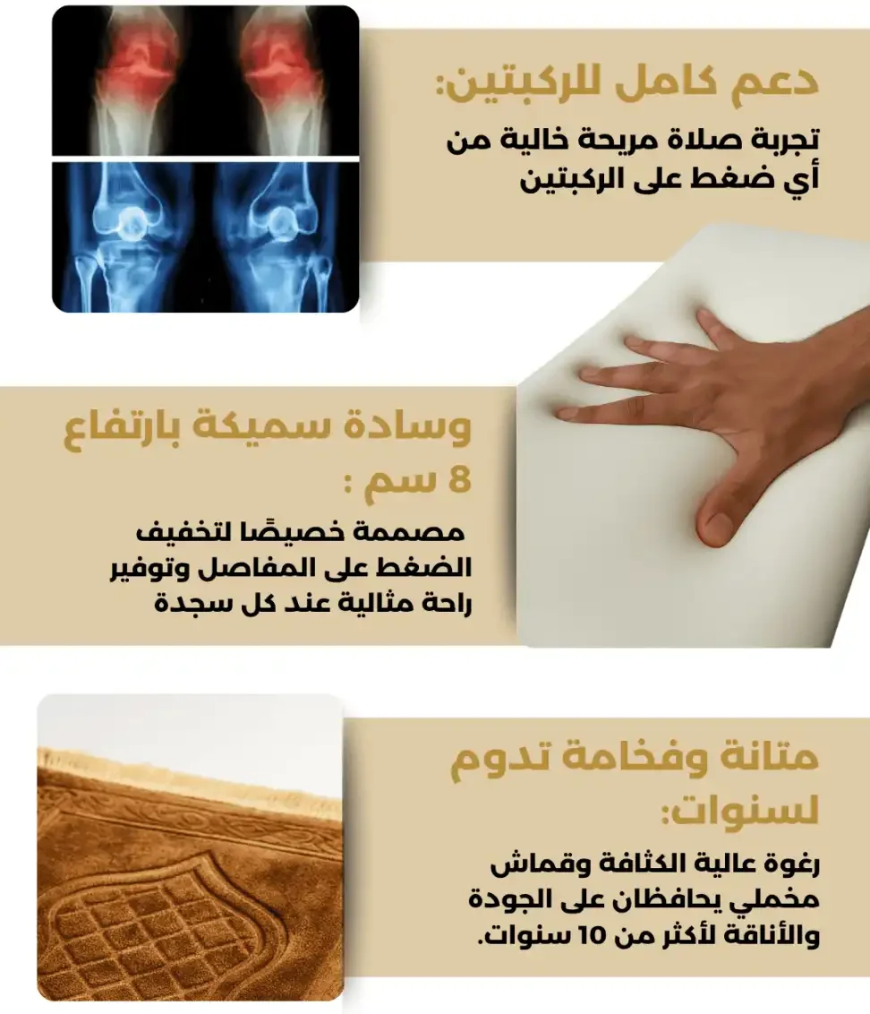 🛒 مع سجادة المحراب، استعد لعيش تجربة صلاة جديدة كليًا، لا ألم فيها، وخشوعك فيها أكثر صفاءً. لا تتردد في طلب سجادتك اليوم، وتمتع براحة جسدية وروحية تدوم طويلًا. 🌟🙏